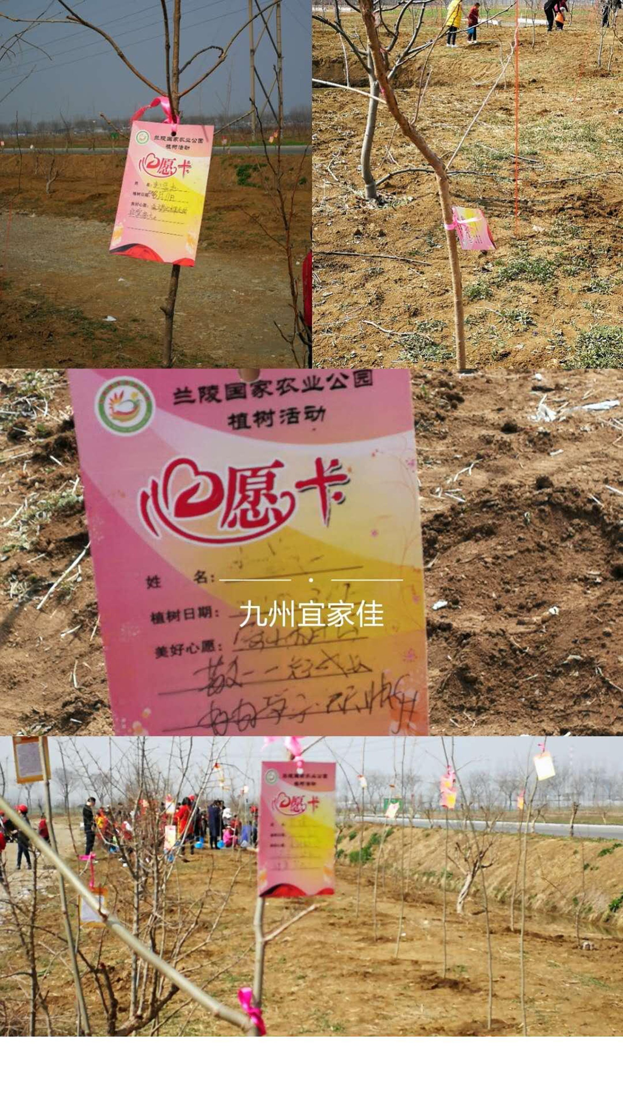 到達指定植樹地點,氛圍頓時更加熱烈起來,無論大人或是孩子,每一個人都迫不及待、躍躍欲試的樣子。在工作人員的指導下,大家挑樹苗,選植樹工具,然后前往各自的區(qū)域開始植樹,挖坑、填土、圍堰、澆水,每個人都樂在其中。不知不覺中一大片空地已經(jīng)栽滿了小樹苗。大家紛紛填寫了心愿卡,并把自己的心愿卡片掛在新栽的小樹上,“希望小樹和我一起快樂成長”“祝九州宜家佳紅紅火火,興旺發(fā)達”“與九州共同成長”“祝孩子聰明伶俐”……滿載著美好祝福的心愿卡與鮮活的小樹一起在春風中舞動。