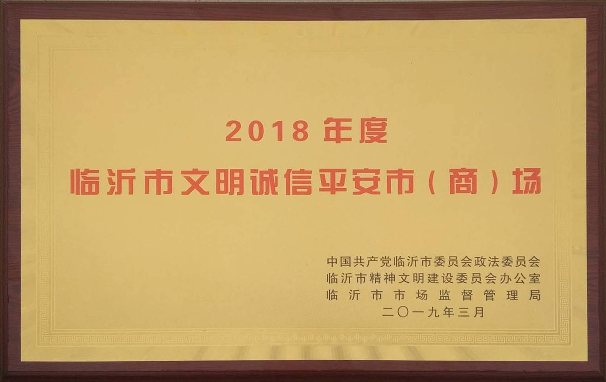 近期,市委政法委、市文明辦、臨沂市市場監(jiān)督管理局對榮獲“2018年度臨沂市文明誠信平安市(商)場”的企業(yè)進行表彰,九州大廈沂水區(qū)域三家門店沂水店、新華店和長安店同時榮獲該榮譽。