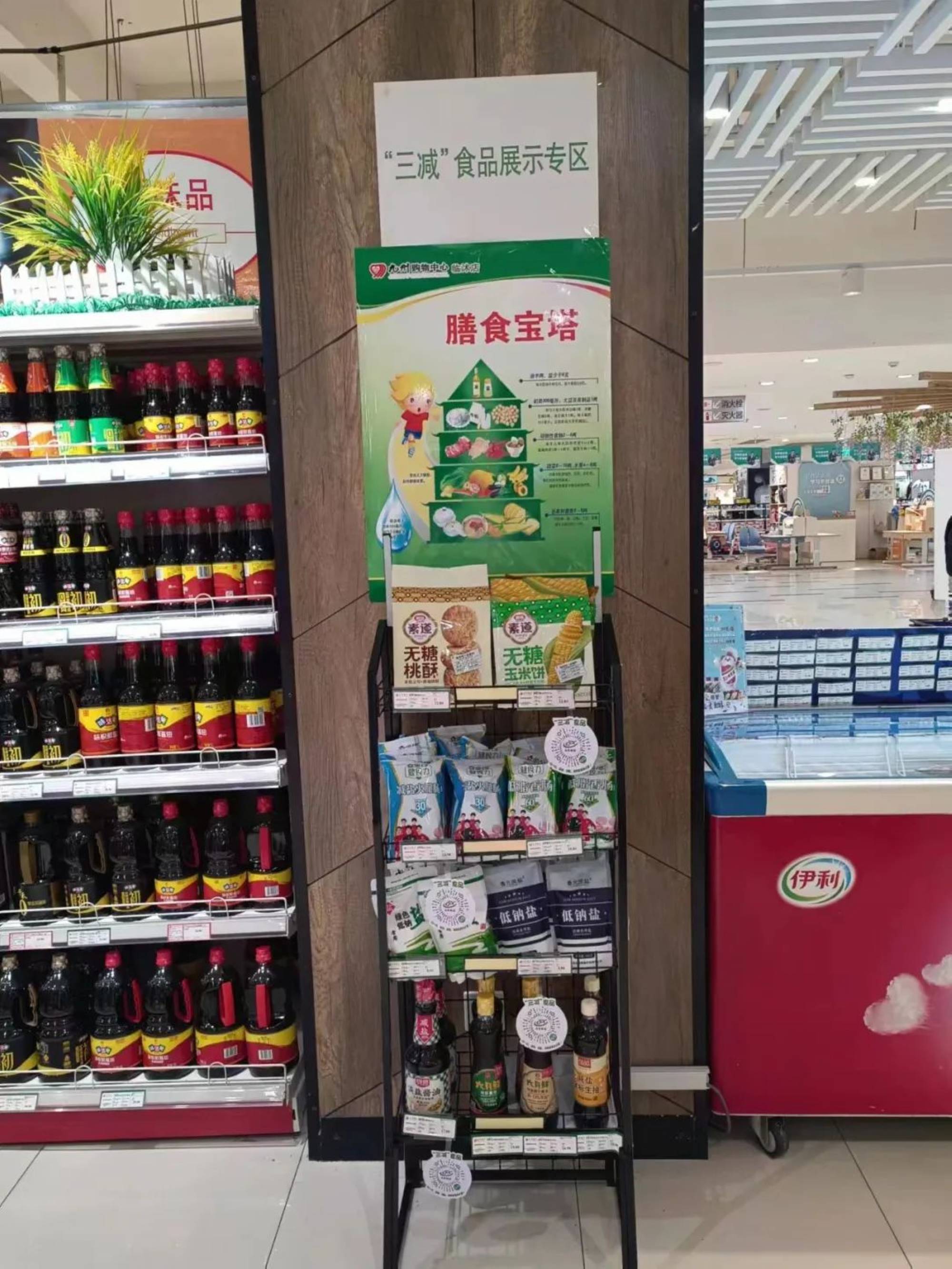 九州商業(yè)大廈臨沭店超市通過(guò)張貼宣傳畫(huà)、提示貼,發(fā)放宣傳單頁(yè)等方式向顧客進(jìn)行宣傳,引導(dǎo)顧客選擇鹽、糖、油含量低的商品,顧客掃描端架張貼的二維碼即可了解“三減”食品及相關(guān)知識(shí)。