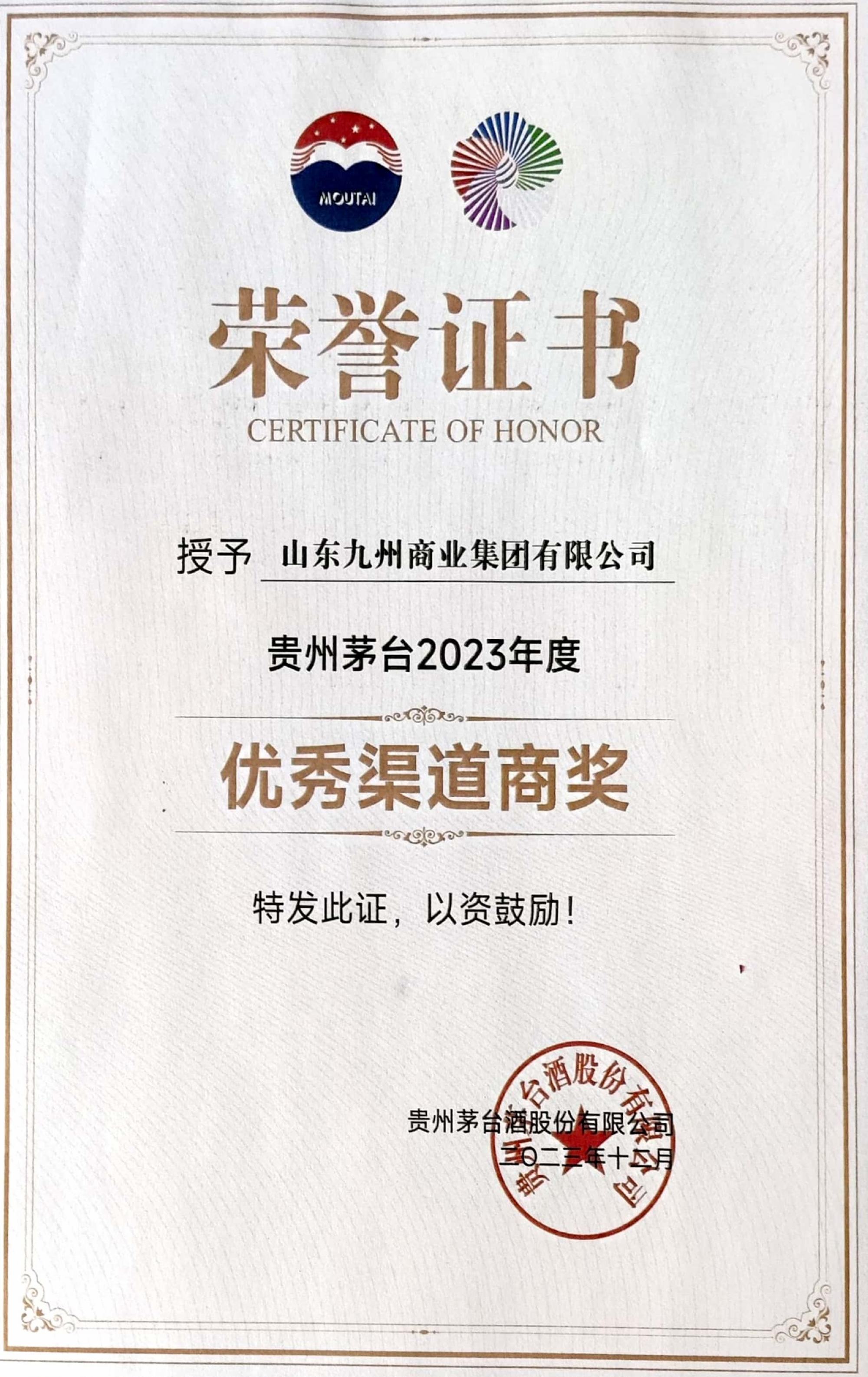 2023年12月31日,貴州茅臺酒市場工作會在三亞召開。會上對在2023年茅臺營銷工作中表現優(yōu)秀的單位及個人進行了表彰。山東九州商業(yè)集團有限公司榮獲“貴州茅臺2023年度優(yōu)秀渠道商獎”。