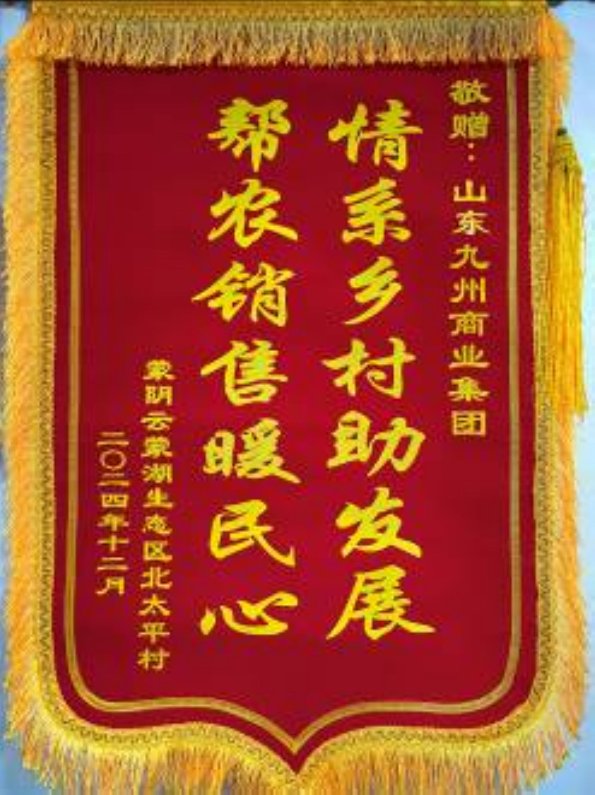 春節(jié)期間,超市公司收到來自蒙陰縣北太平村駐村書記送來的一面錦旗,感謝九州集團(tuán)“情系鄉(xiāng)村助發(fā)展,幫農(nóng)銷售暖民心”,為蒙陰縣北太平村村民銷售了滯銷的四萬余斤陽光玫瑰葡萄。
