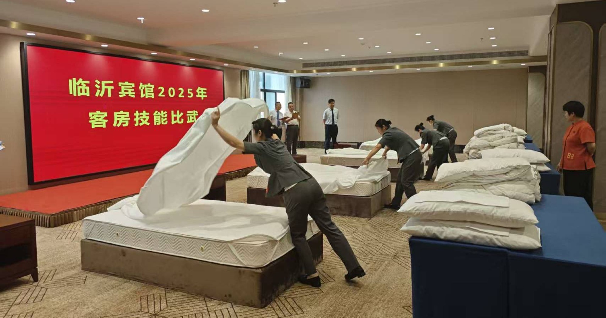 9月28日下午,臨沂賓館中式鋪床技能比武在沂蒙路店貴賓樓多功能廳舉行。本次技能比武分為中式鋪床、開夜床兩項,共有18名選手參加,以實操比拼展現(xiàn)服務(wù)專業(yè)素養(yǎng)。