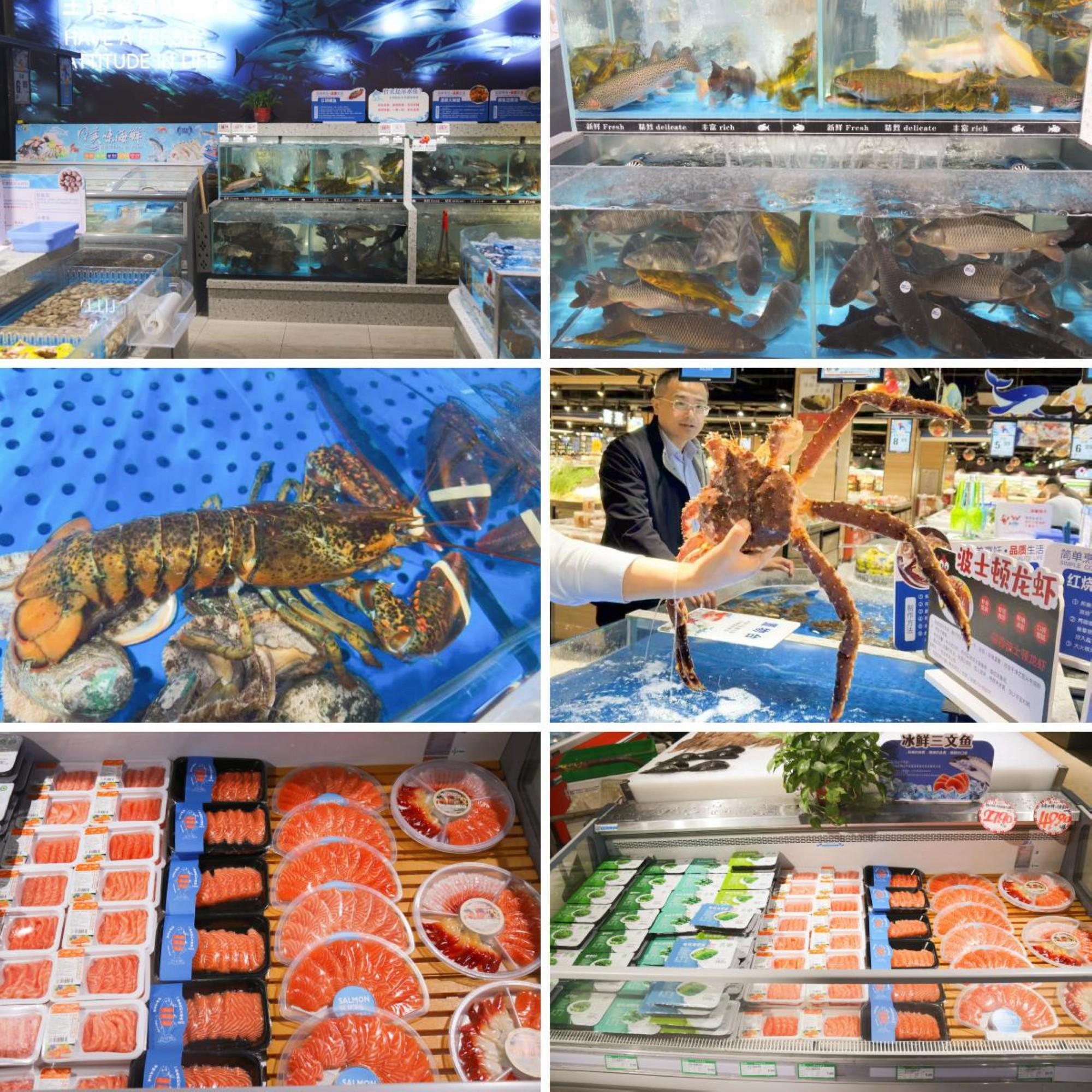 水產區(qū)設備全部煥新,引進帝王蟹、珍寶蟹、波士頓龍蝦、多寶魚、石斑魚、吊水虹鱒魚、冰鮮三文魚等鮮活水產品,并通過全程冷鏈直達門店,將新鮮送到消費者手中。
