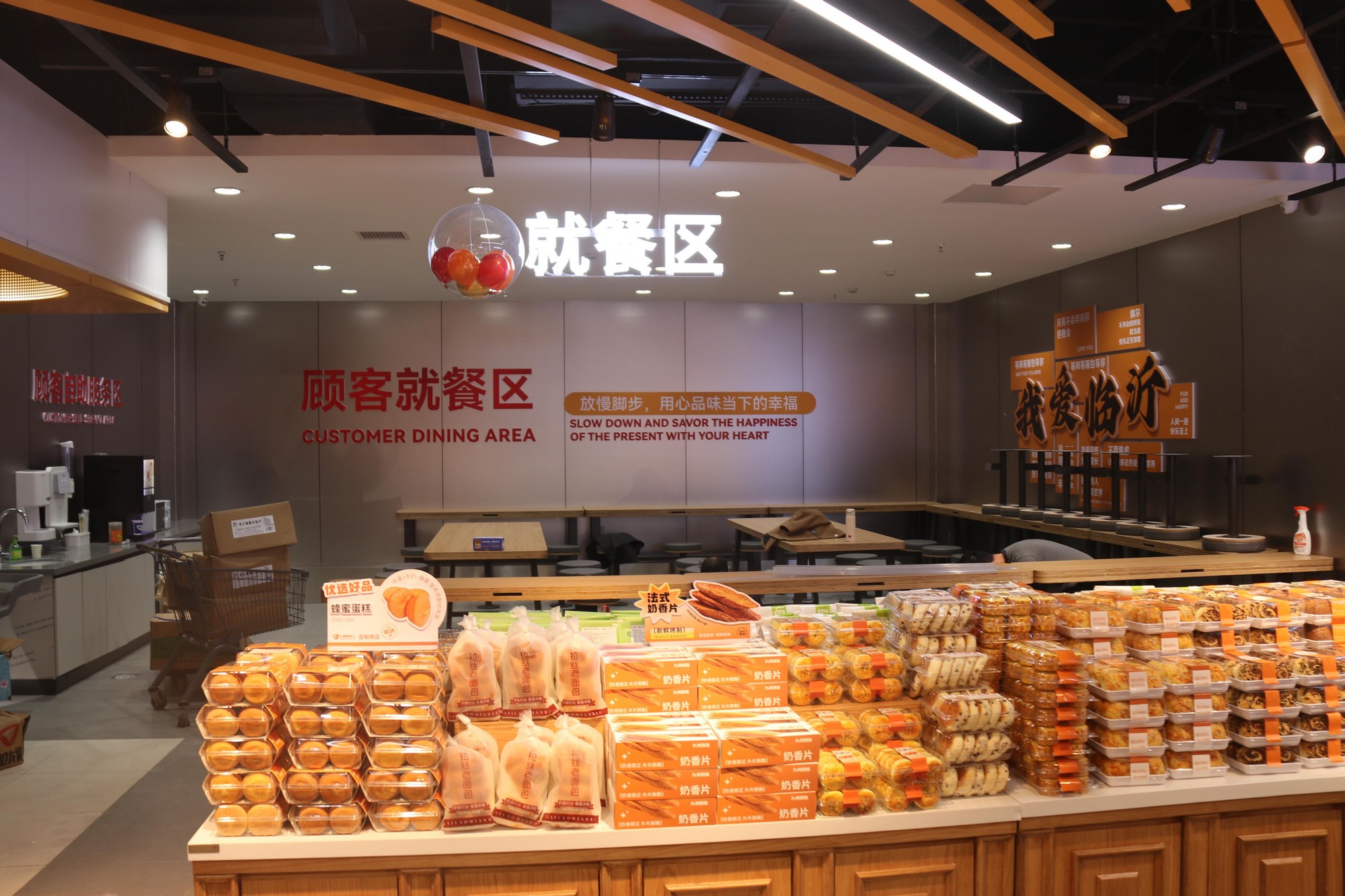 除品類擴容外,門店還新增顧客就餐區(qū),打破了“逛”與“吃”的場景邊界,搭配自助咖啡機、自助豆?jié){機等服務設備,讓消費者在購物間隙即可便捷享受美食。