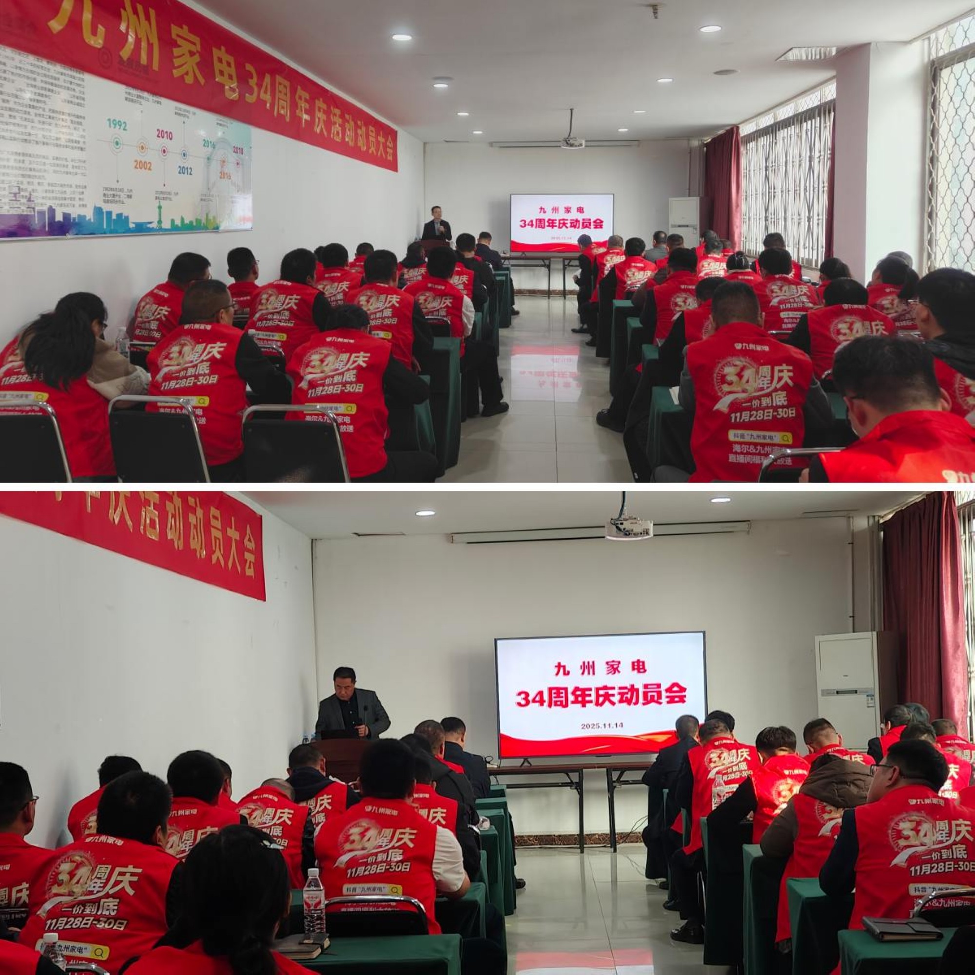 11月14日下午,九州家電34周年慶動(dòng)員會(huì)在解放路店二樓會(huì)議室召開。九州家電主管及以上管理人員共50余人參加了會(huì)議。