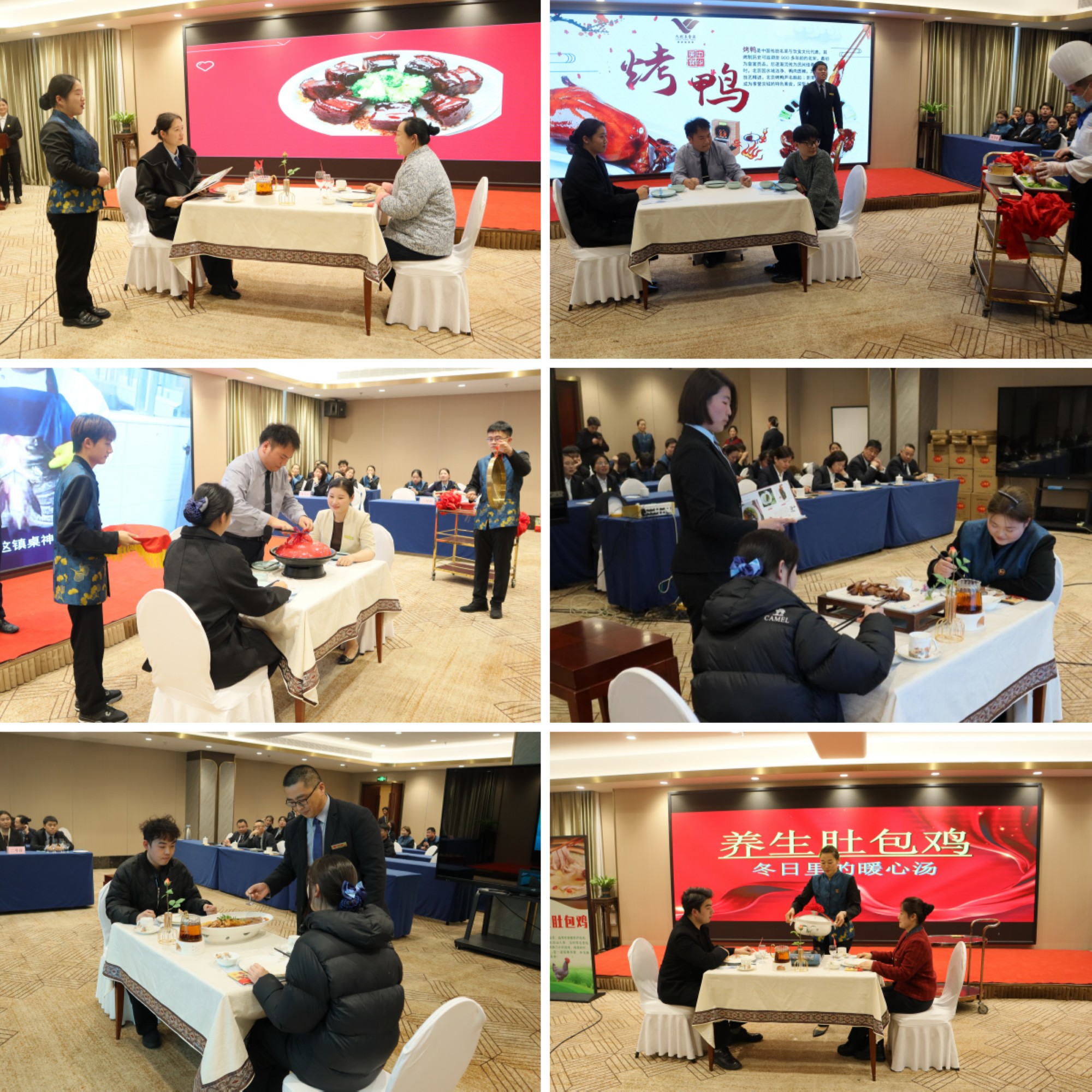 本次競(jìng)賽設(shè)有必答題、搶答題和情景模擬等環(huán)節(jié);必答題環(huán)節(jié)選手按順序獨(dú)立作答,檢驗(yàn)菜品知識(shí)儲(chǔ)備;搶答題環(huán)節(jié)既要配合搶答又要熟練掌握菜品特色,節(jié)奏緊湊、你來我往,充分展現(xiàn)出比拼的激烈;情景模擬環(huán)節(jié)聚焦貴妃紅燒肉、九州烤鴨、黃燜胖魚頭、脆皮乳鴿、膠東燜魚、養(yǎng)生肚包雞等賓館招牌經(jīng)典菜,現(xiàn)場(chǎng)演繹服務(wù)場(chǎng)景、介紹菜品特色及文化,贏得陣陣掌聲。