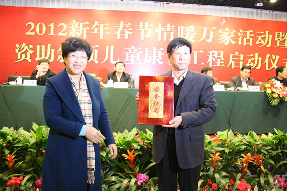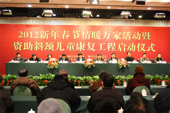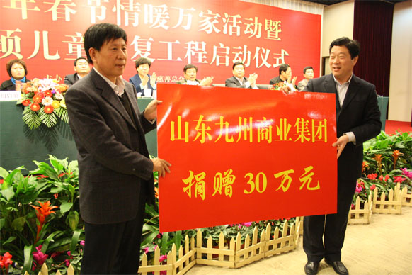 12月10日,2012年臨沂市新年春節(jié)情暖萬家活動啟動儀式在臨沂賓館舉行,活動現(xiàn)場同時舉行了斜頸兒童康復工程啟動儀式,并為困難家庭發(fā)放了資助金。市政協(xié)副主席趙愛華,市直有關(guān)部門領(lǐng)導出席啟動儀式。 活動現(xiàn)場,九州集團向臨沂市慈善總會捐款30萬元,用于資助困難家庭。集團黨委書記王佐文出席啟動儀式并代表集團進行了現(xiàn)場捐贈。